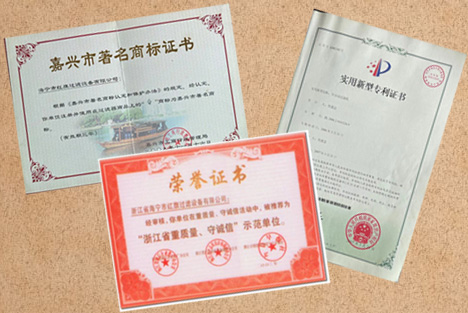 紅旗過濾全自動過濾機(jī)專利證書和多項榮譽證書